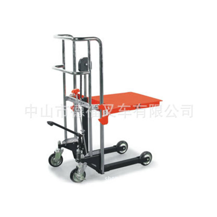 · 輕型設(shè)計(jì),回轉(zhuǎn)半徑小,操作輕巧靈活,提升時(shí)踩動(dòng)腳踏柄,降低時(shí)逆時(shí)針旋轉(zhuǎn)手動(dòng)閥使平臺(tái)下降,帶剎車轉(zhuǎn)向輪,橡膠輪胎。